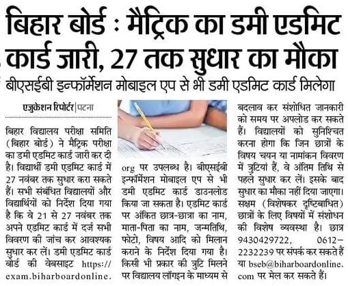 बिहार बोर्ड मैट्रिक डमी एडमिट कार्ड डाउनलोड एवं सुधार करवाने की अंतिम तिथि 27 नवंबर 2026 तक रखी गई है।