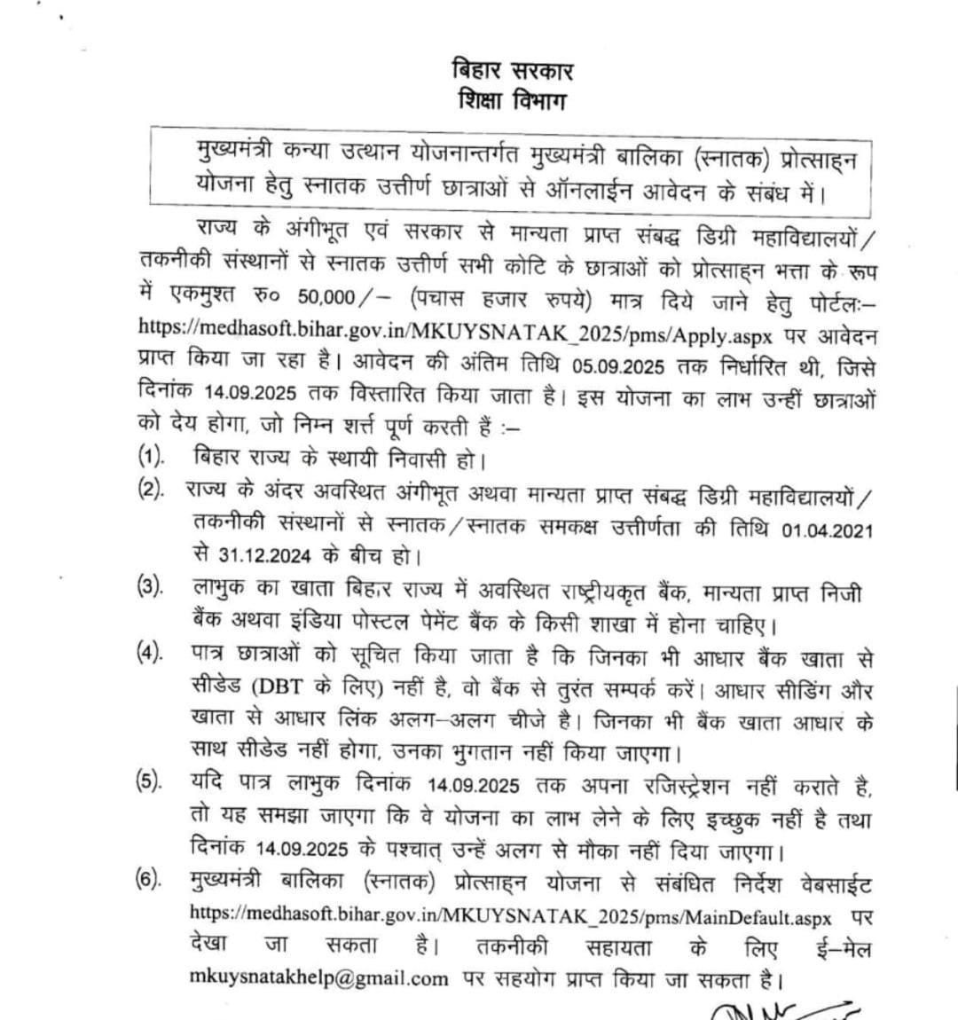 Bihar Graduation Pass Scholarship 2025 Date Extended Notice |